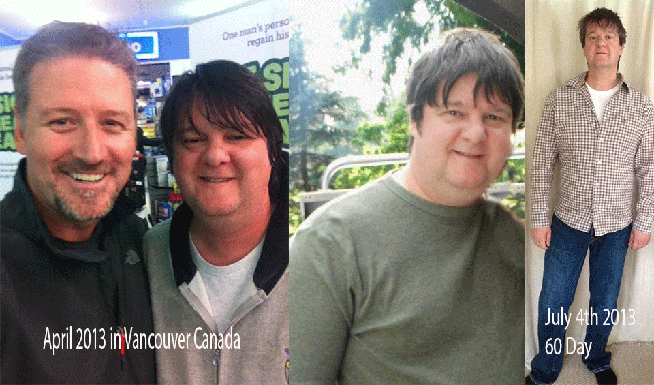 I lost a total of 55 lb/25 kg in 60 days. My starting weight was 245 lb/111 kg and I’m now 190 lb/86 kg.